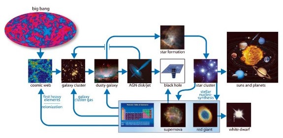 universe. "Galactic clouds spawn clusters of stars, only a few of which (the more massive ones unlike the Sun) enable other, subsequent populations of stars to emerge in turn, with each generation's offspring showing slight variations, especially among the heavy elements contained within. Waves of "sequential star formation" propagate through many such clouds like slow-motion chain reactions over eons of time - shocks from the death of old stars triggering the birth of new ones - neither one kind of star displaying a dramatic increase in number nor the process of regeneration ever being perfect. Those massive stars selected by Nature to endure the fires needed to produce heavy elements are in fact the very same stars that often create new populations of stars, thereby both episodically and gradually enriching the interstellar medium with greater elemental complexity on timescales measured in millions of millennia; such rising complexity, further promotes planetary systems that act as advantageous abodes for life as we know it." (p. 161) (Cosmic Evolution, Eric J. Chaisson, Harvard Univ. Press, 2001) | |
